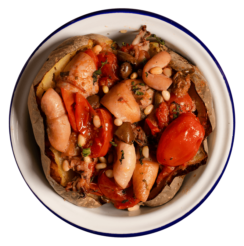 Calamari alla mediterranea con pomodoro, capperi, olive e pinoli