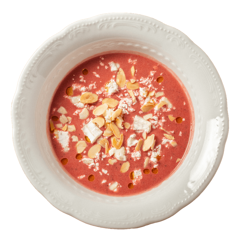 Vellutata di barbabietola rossa caprino e mandorle tostate